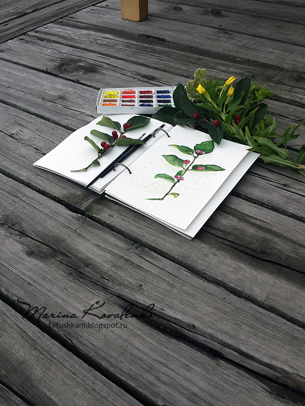 Когда с утра на море дождь (единственный раз за неделю) - самое оно заняться рисованием, предварительно выйдя на поиски "модели". Растительность в бухте довольно скудная ( в смысле цветущих растений), но спас кустарник с ягодами)))